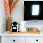 Hvert værelse har et fladskærms TV med satellitkanaler, et fladskærm og en kaffemaskine samt en el-kedel, et køleskab og glas i et fælles køkken.